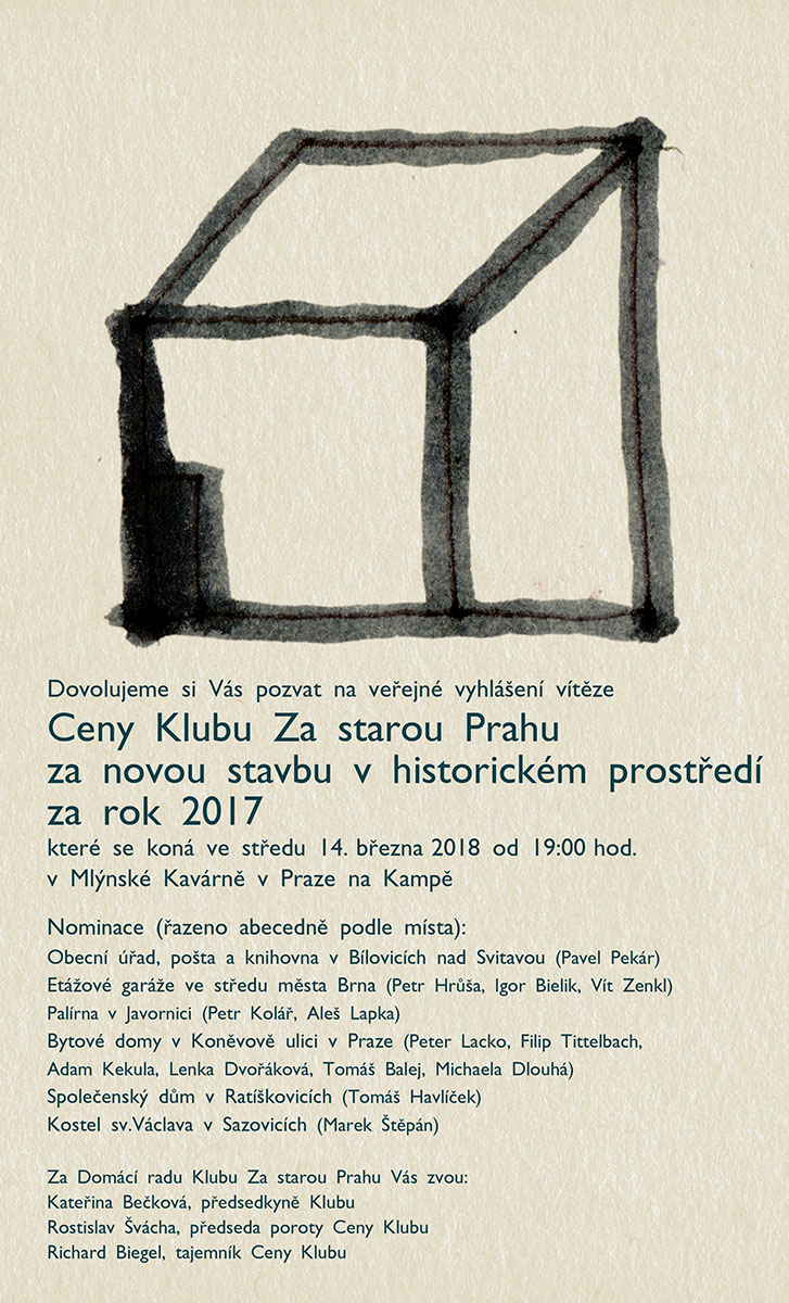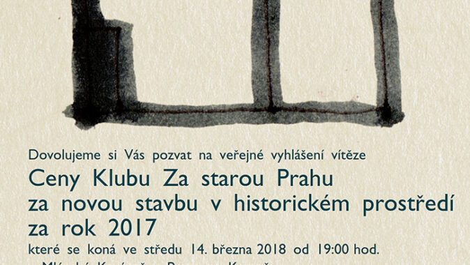 Veřejné vyhlášení vítěze Ceny Klubu Za starou Prahu za novou stavbu v historickém prostředí za rok 2017 se koná ve středu 14. března 2018 od 19:00 hod. v Mlýnské Kavárně v Praze na Kampě.