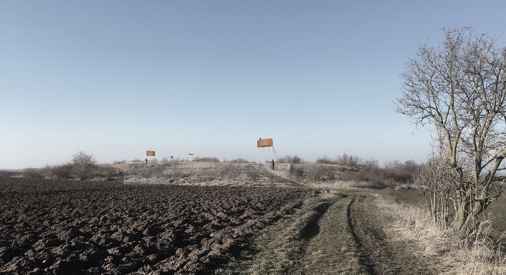 „Vyhlídka je na každém českém poli, jenom ji tak nevnímáme. Posed je symbolem naší krajiny, tak se na něj posaďme a rozhlédněme se,“ popisuje svůj koncept Tomáš Kodet. Jeho vyhlídku v místě bývalé odkalovací nádrže tvoří celkem tři posedy. Jsou rozmístěné tak, aby se každý díval do jiného směru a navzájem mezi sebou komunikovaly. Princip konstrukce budou mít posedy shodný, lišit se budou ve tvaru pozorovatelny. Silo, Židle a Lavička, jak je studenti ateliéru Hlaváček–Čeněk podle jejich podoby pracovně pojmenovali, budou vyhlížet z nejvyššího bodu nad Libčicemi do Českého středohoří, na Hlaváčkovou stráň na protějším břehu Vltavy a za dobré viditelnosti i na Prahu.