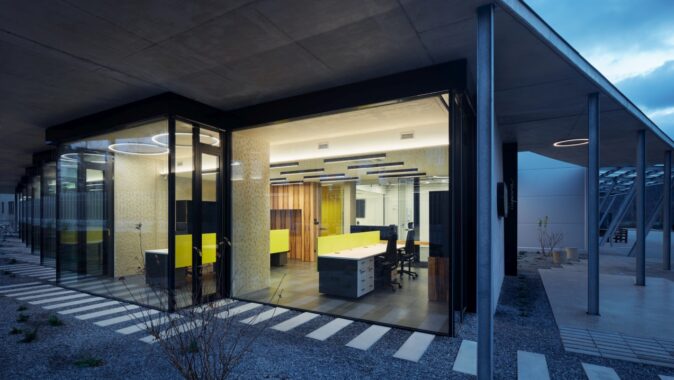 Princip zubatosti – výborně se uplatnil v půdorysně trojúhelníkovém prostoru vymezeném pro administrativní část. Jednotlivé kanceláře jsou odskočeny vždy o jeden modul, do ulice vytváří princip klíče – zapadajících zubů.