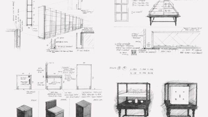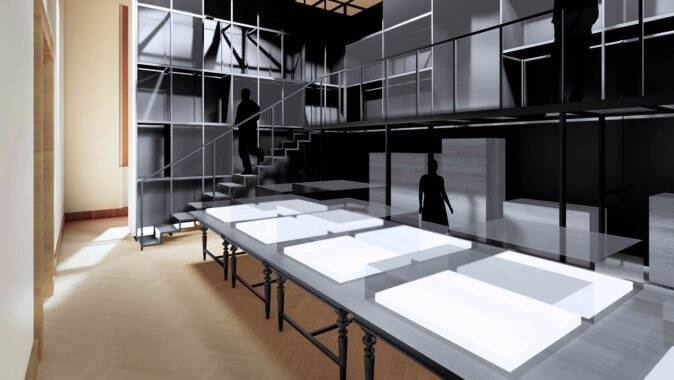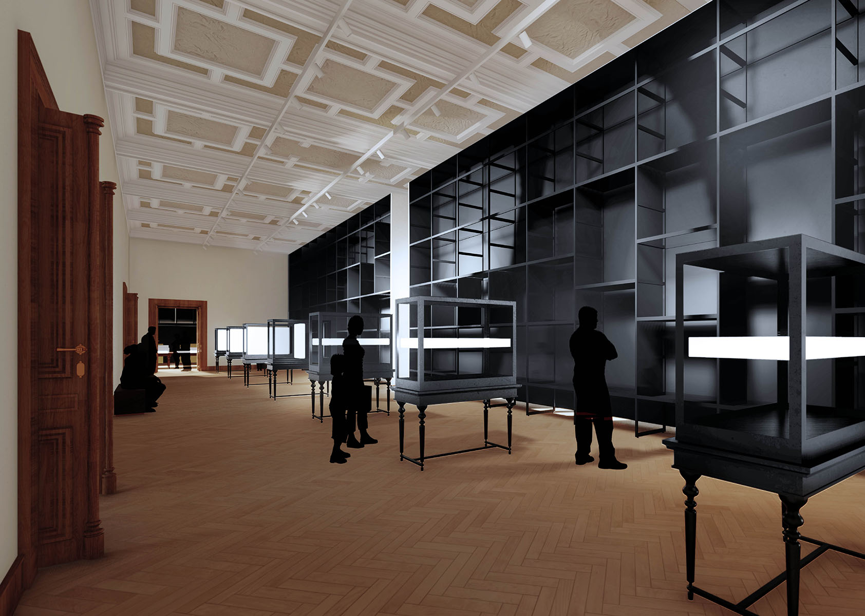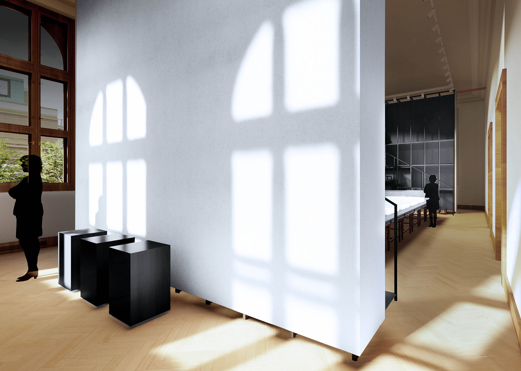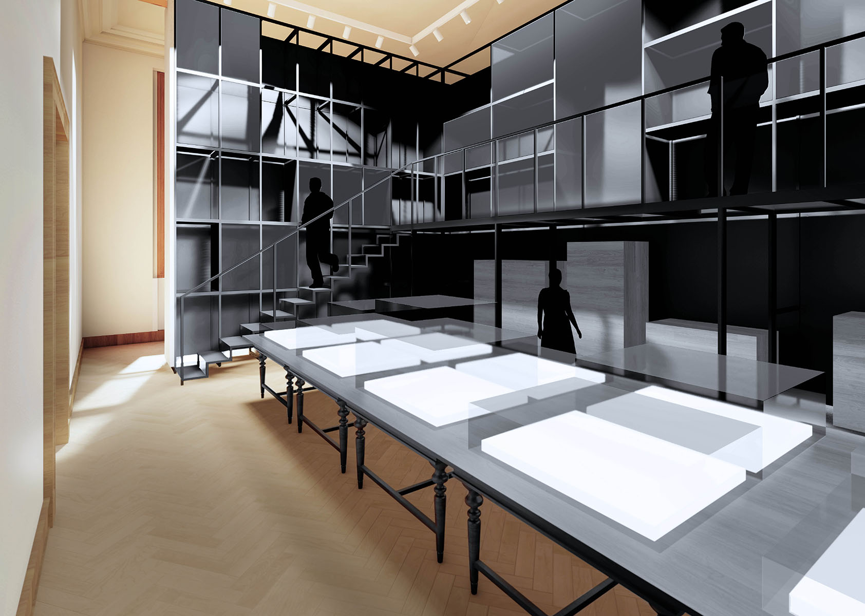 historického mobiliáře UPM, který návrh upravuje pro expozici pomocí moderních