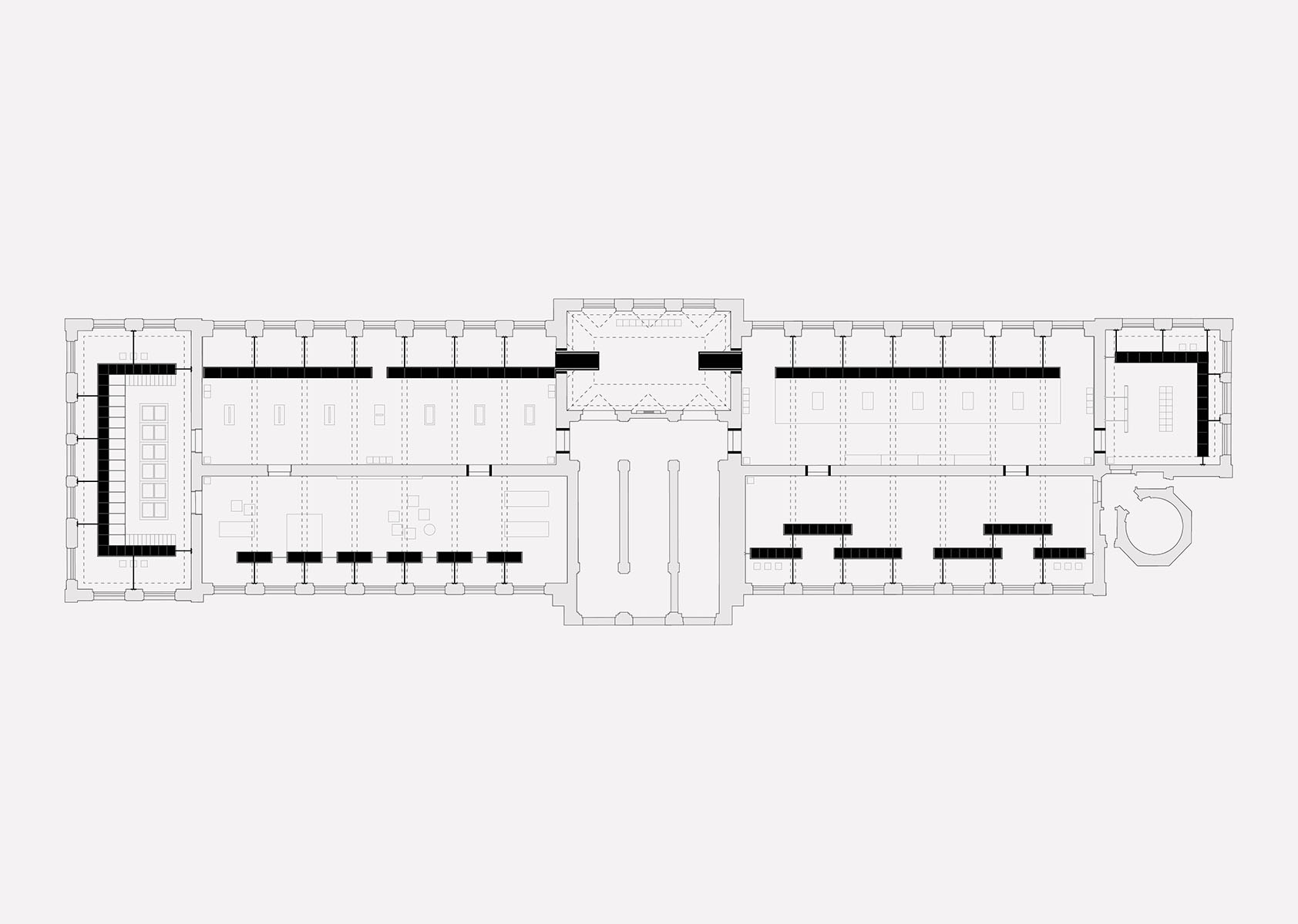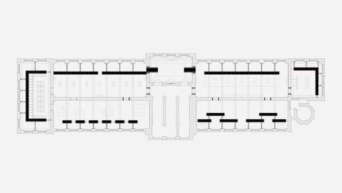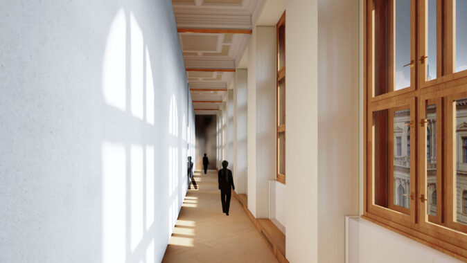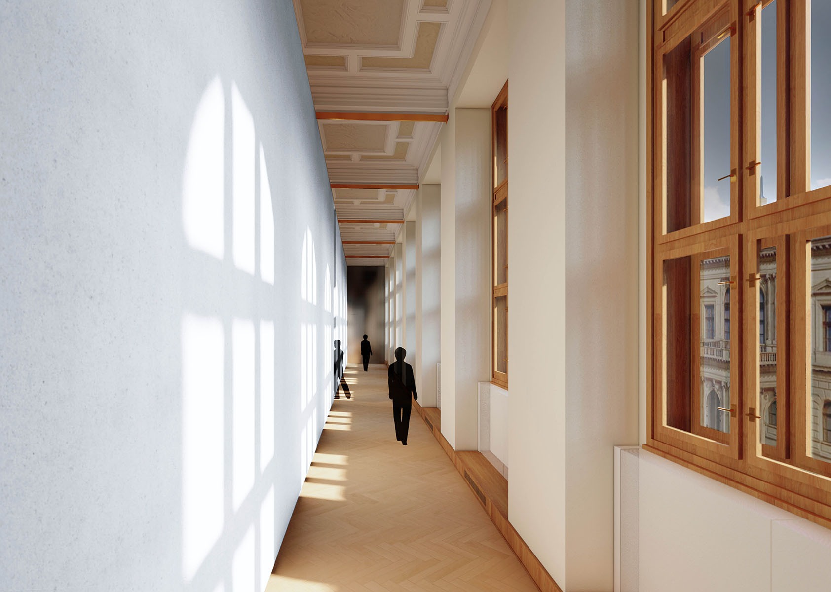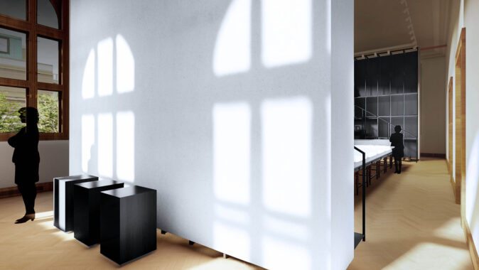 pracuje s architekturou budovy UPM. Pojetí návrhu je tradiční, ale dynamické a