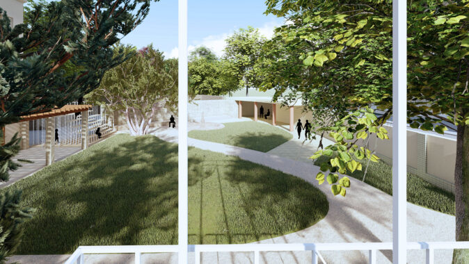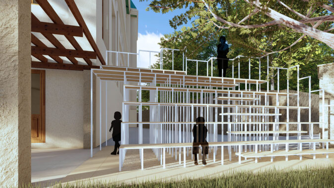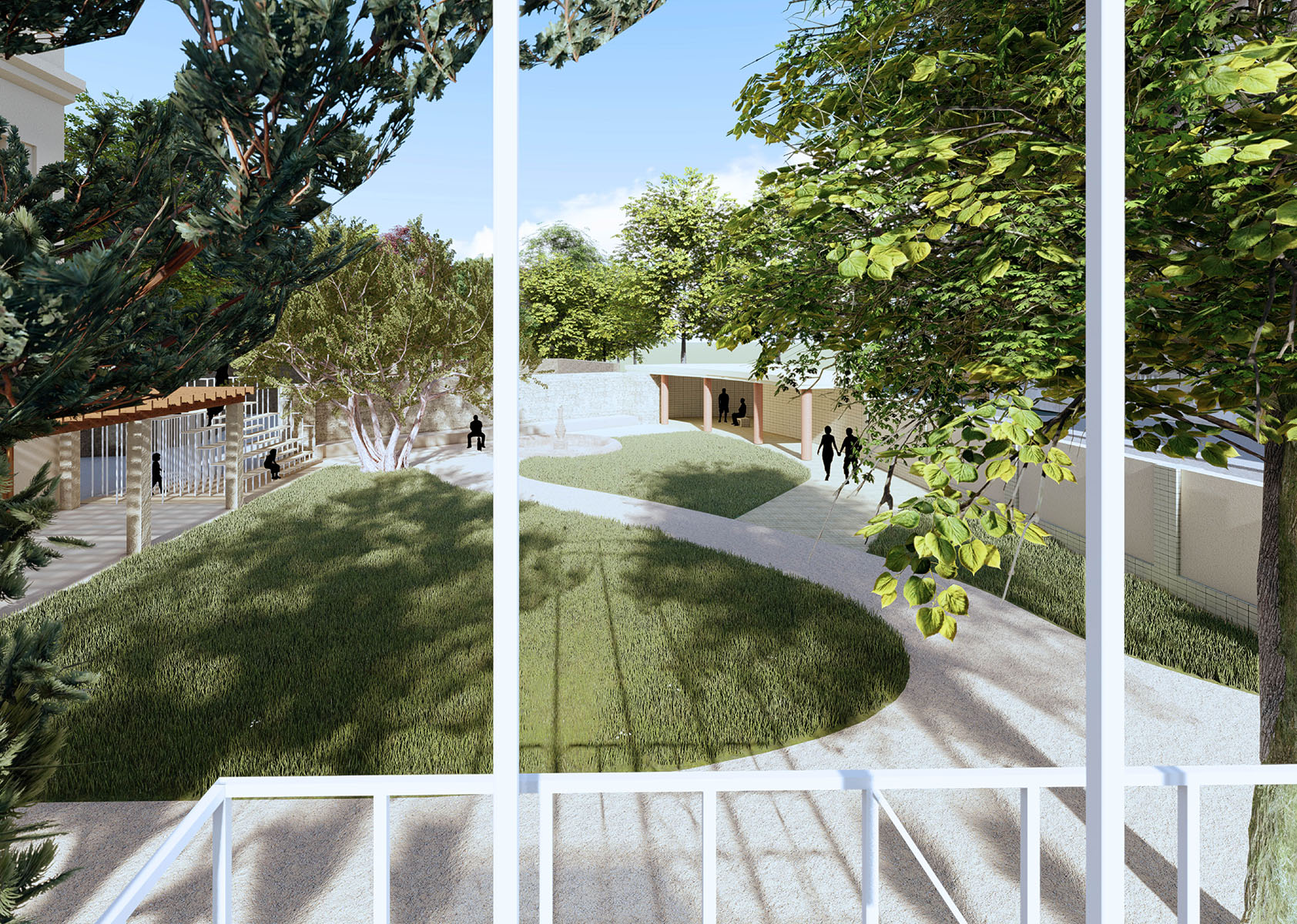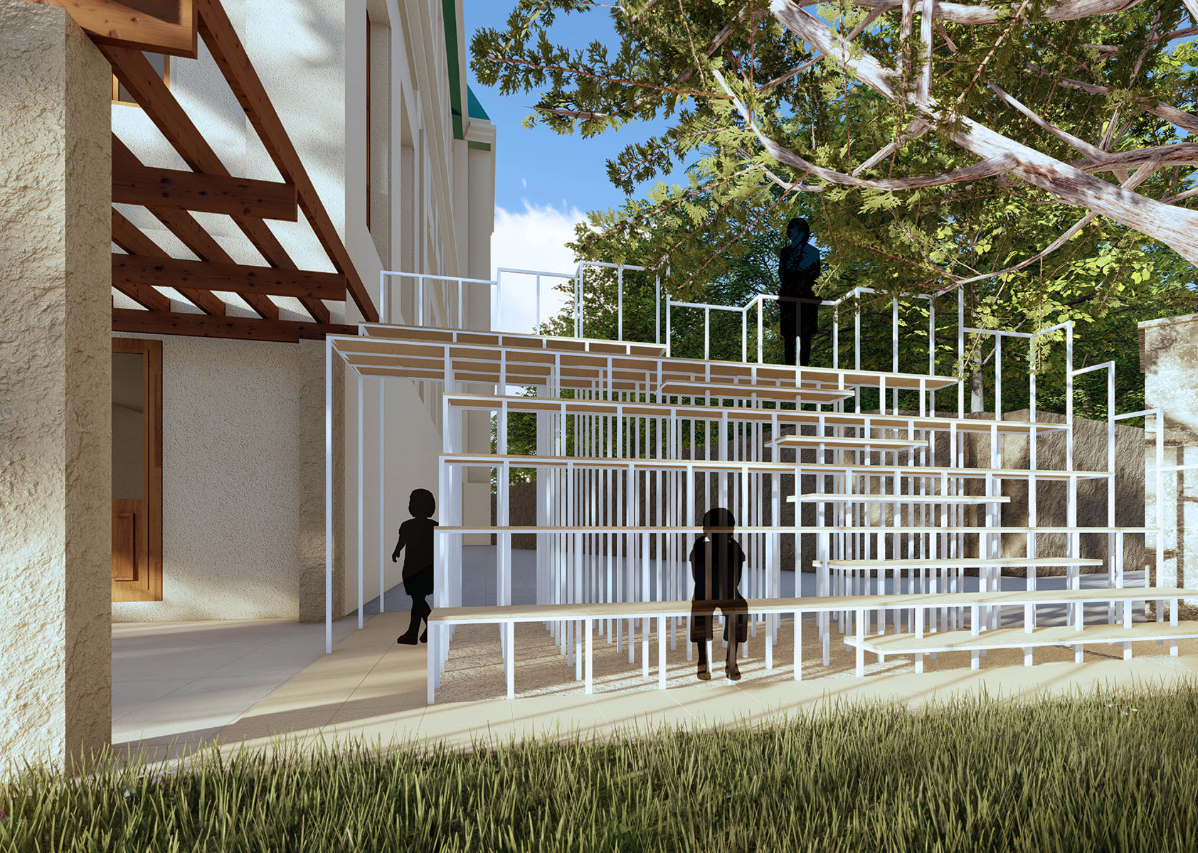 vzniká prostor pro odpočinek a workshopy. Do zahrady je umístěna vyhlídková