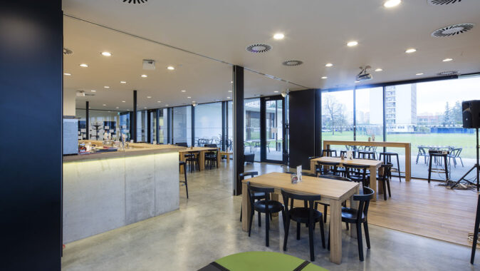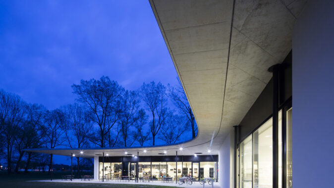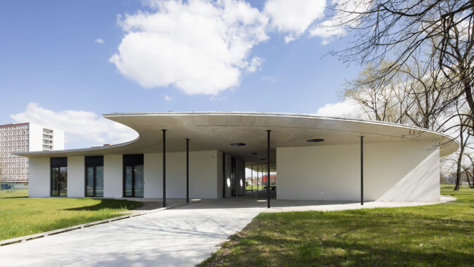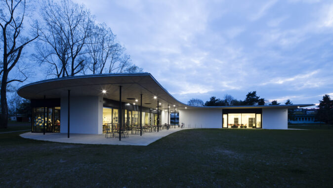 Elegantně působící architektura přízemního pavilonu zasazená do parkově upraveného prostředí kombinuje svými proporcemi vylehčeně působící markýzu z pohledového betonu se svislými stěnami střídající prosklení v černých rámech na celou světlou výšku se světlými omítnutými částmi obvodového pláště. Kombinace těchto materiálů (pohledový beton, sklo, omítnutá zeď) se ukazuje jako dobrá volba. Přispívá k tomu i řemeslně zvládnuté provedení omítkové směsi Baumit CreativTop-Fine s jemným zrnem 1 mm. Materiálům vyšší kvalitativní řady se tak dostává odpovídající péče při jejich aplikaci na stavebním díle.
