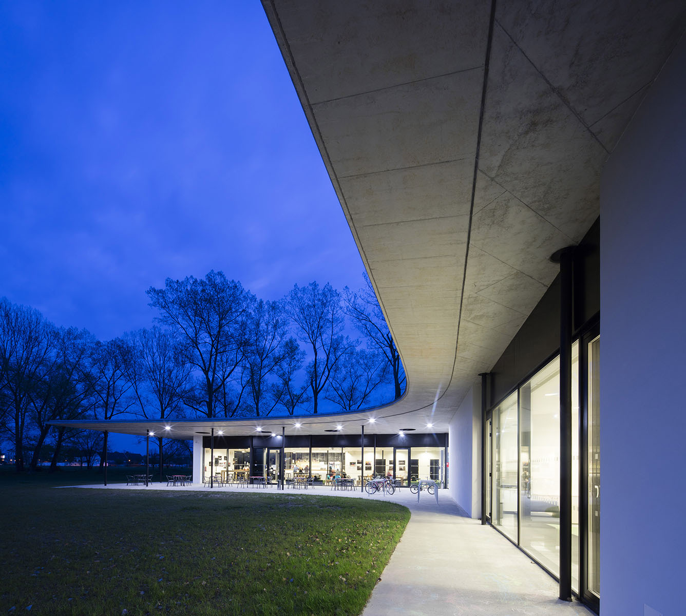 Elegantně působící architektura přízemního pavilonu zasazená do parkově upraveného prostředí kombinuje svými proporcemi vylehčeně působící markýzu z pohledového betonu se svislými stěnami střídající prosklení v černých rámech na celou světlou výšku se světlými omítnutými částmi obvodového pláště. Kombinace těchto materiálů (pohledový beton, sklo, omítnutá zeď) se ukazuje jako dobrá volba. Přispívá k tomu i řemeslně zvládnuté provedení omítkové směsi Baumit CreativTop-Fine s jemným zrnem 1 mm. Materiálům vyšší kvalitativní řady se tak dostává odpovídající péče při jejich aplikaci na stavebním díle.