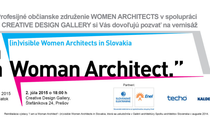 Občianske združenie WOMEN ARCHITECTS v spolupráci s Creative Design Gallery pozýva všetkých priateľov architektúry na vernisáž výstavy „I am a Woman Architect“ – in(visible) Women Architects in Slovakia, ktorá sa uskutoční vo štvrtok 02.07.2015 o 18.00h. v Creative Design Gallery na Štefánikovej 24 v Prešove.