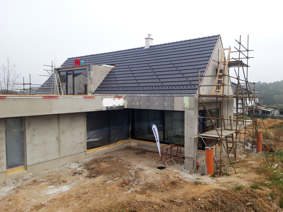 Bez kvalitní střechy nemůže splnit dům nároky kladené na moderní výstavbu.Proto byla u e4 domu zvolena nejenom kvalitní pálená taška Tondach Figaro11, ale také nadkrokevní izolace Tondach iRoof. Volba izolantu a technologie aplikace jsou totiž pro životnost střechy určující. Na krokve byla položena nadkrokevní izolace Tondach iRoof tloušťky 120 mm. Izolant patří v současné době mezi nejkvalitnější a nejvýkonnější. Desky jsou z tvrdé polyisokyanurátové pěny (PIR) a tvoří difúzně otevřený systém. Výhodou oproti klasickým izolantům je mj. nižší tloušťka desky při zachování stejného tepelně izolačního výkonu. Při aplikaci PIR izolací nevznikají tepelné mosty. Další výhodou je tvrdost desek umožňující snazší pohyb po střešním plášti a rychlost pokládky celého systému. Do připraveného laťování se kladly střešní tašky Tondach Figaro11 opatřené povrchovou úpravou engoba. Taška Figaro však vyniká zejména svým plochým designem, který sluší zejména moderním a trendovým domům. Pálená střešní krytina Tondach má velmi dlouhou životnost, je stálobarevná a nevybledne a odolá i velmi nepříznivým povětrnostním vlivům.