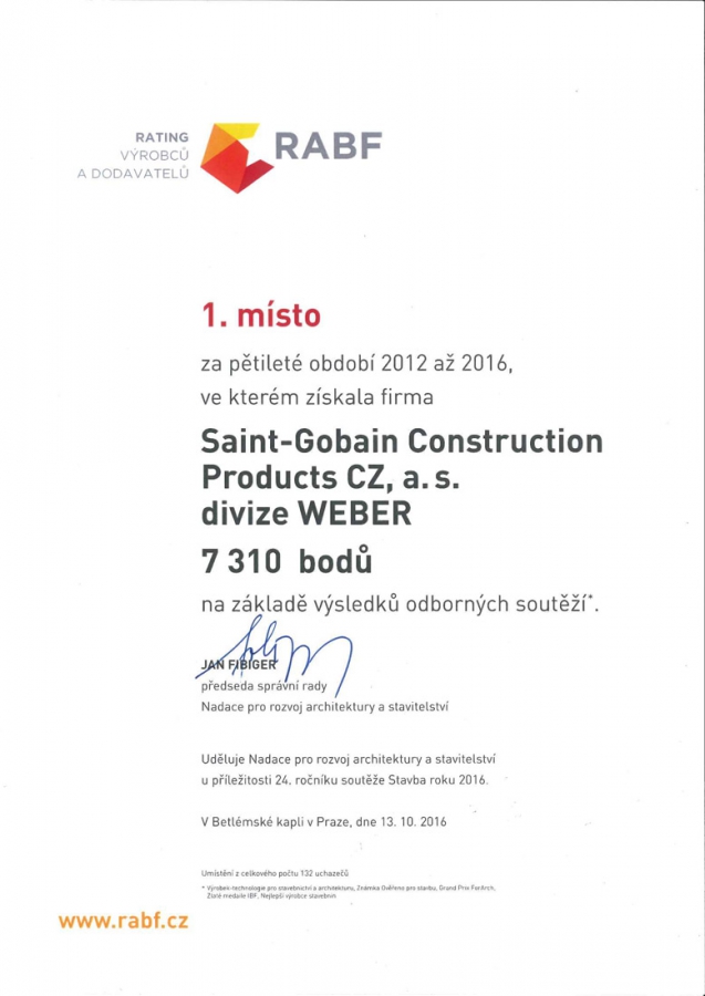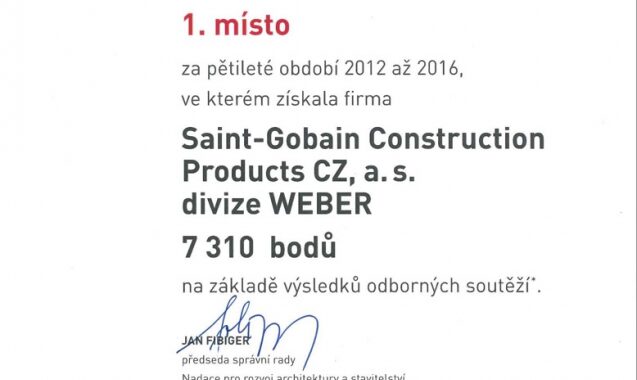 Divize Weber společnosti Saint-Gobain Construction Products CZ obdržela 1. místo v ratingu výrobců a dodavatelů stavebních materiálů RABF, který sestavuje Nadace pro rozvoj architektury a stavitelství za pětileté období 2012–2016. Toto ocenění je udělováno a hodnoceno na základě dosažení dlouhodobých výsledků v oblasti inovací a kvality výrobků a služeb. Posuzovalo se celkem 132 firem.