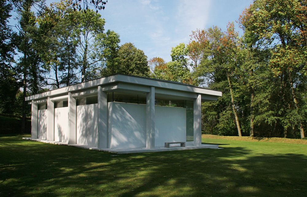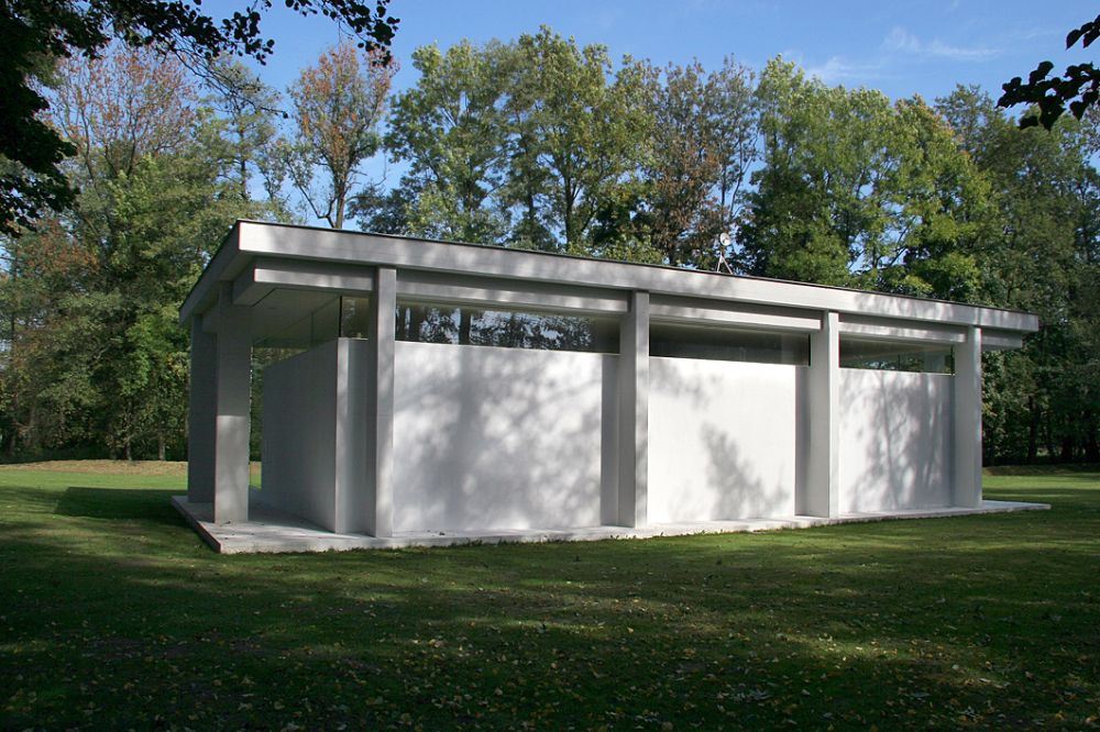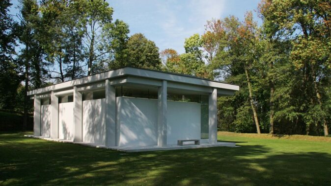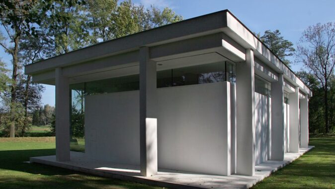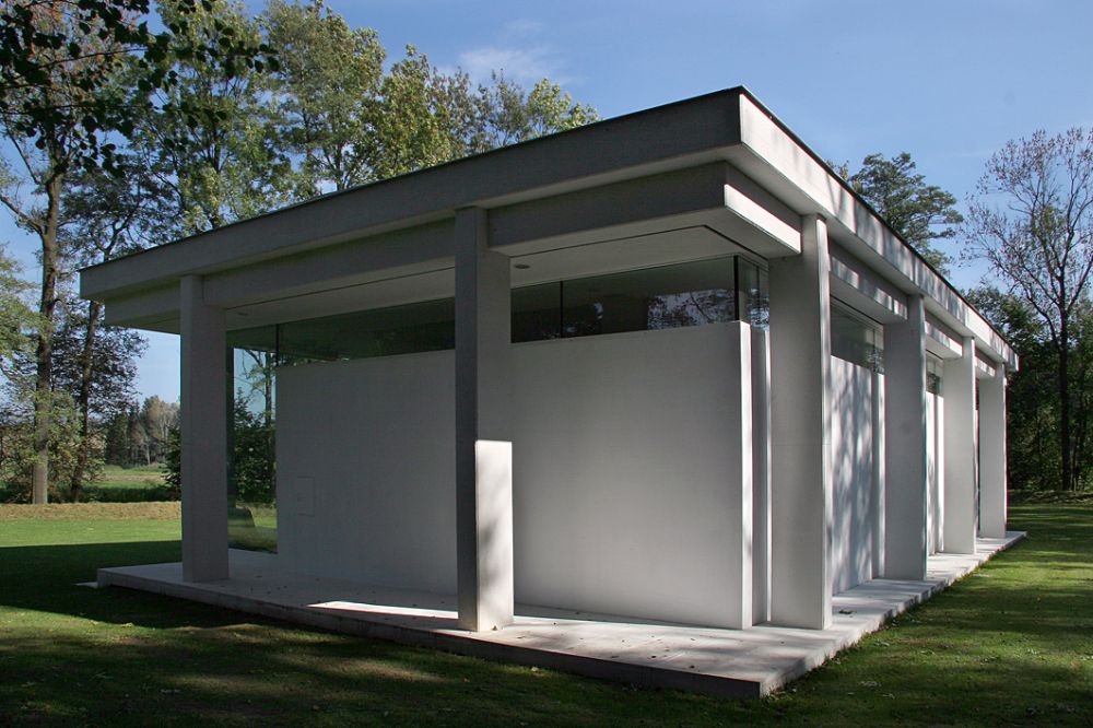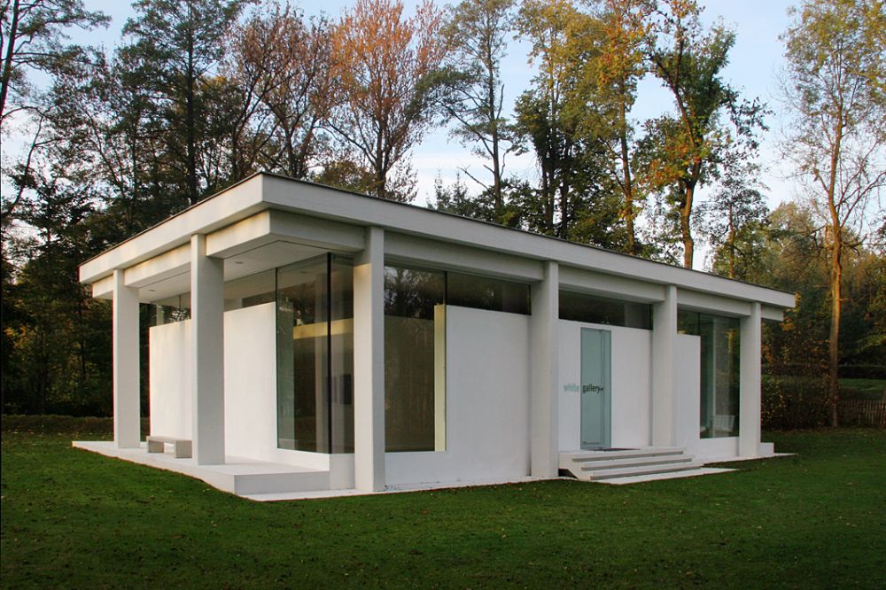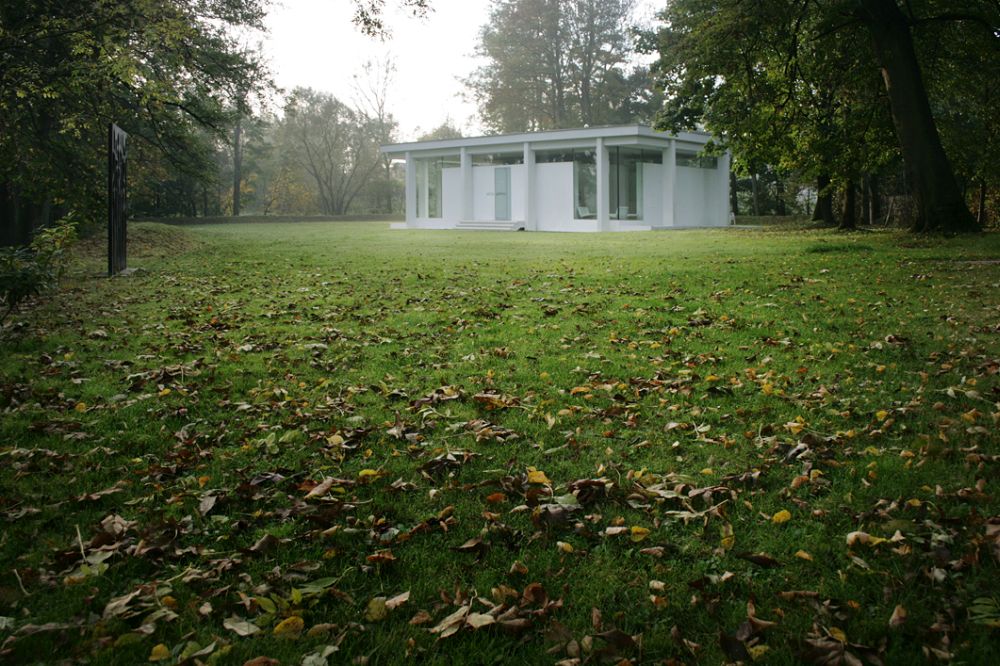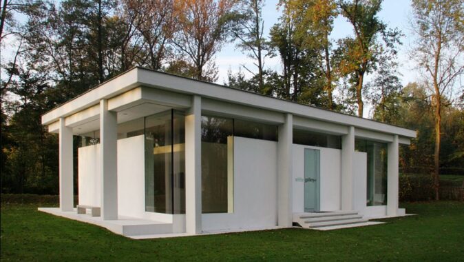 přísně geometrická stavba galerie ze skla a železobetonu stojí na louce v