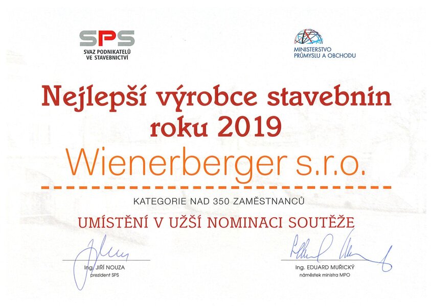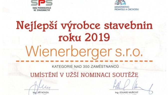 V rámci třináctého ročníku soutěže Nejlepší výrobce stavebnin roku 2019 získal cenu Ministerstva průmyslu a obchodu ČR a Svazu podnikatelů ve stavebnictví ČR výrobce cihelného systému Porotherm a střešní krytiny Tondach společnost Wienerberger s.r.o.