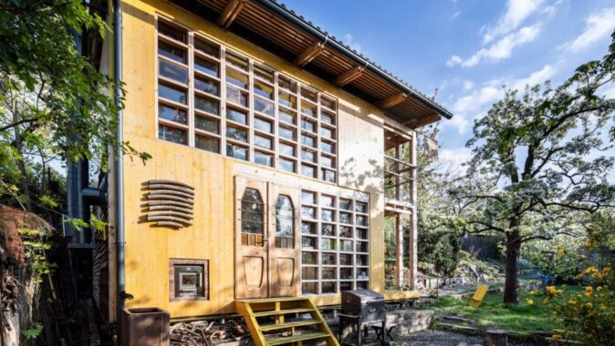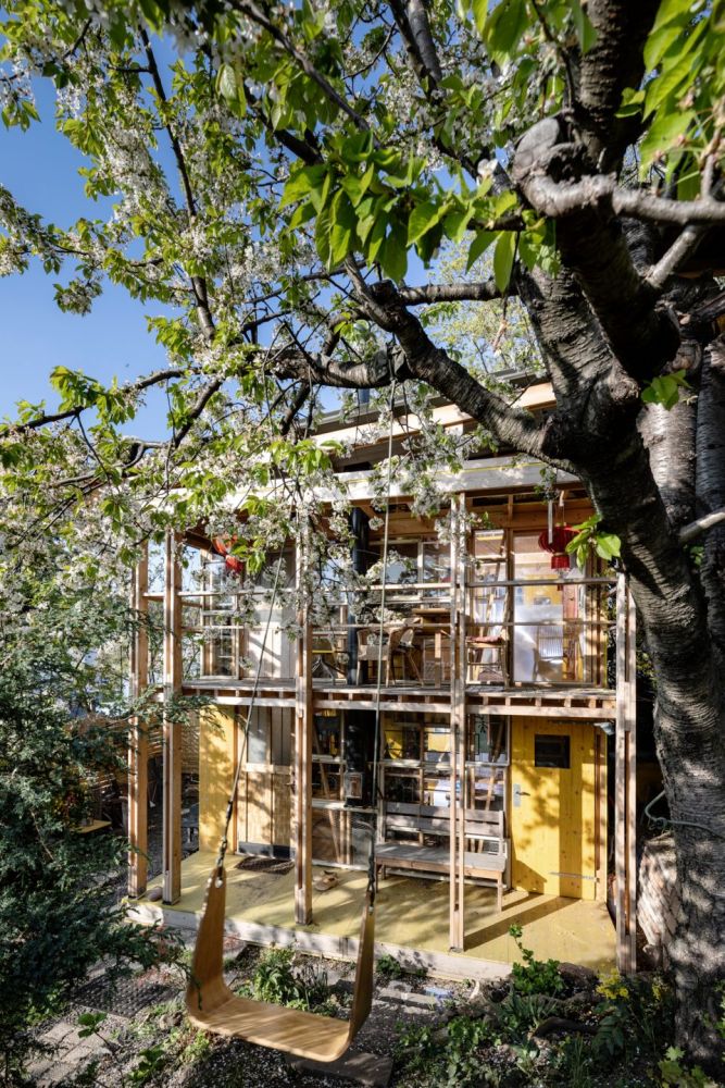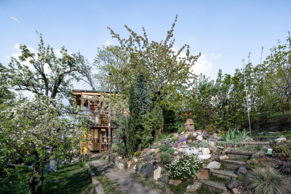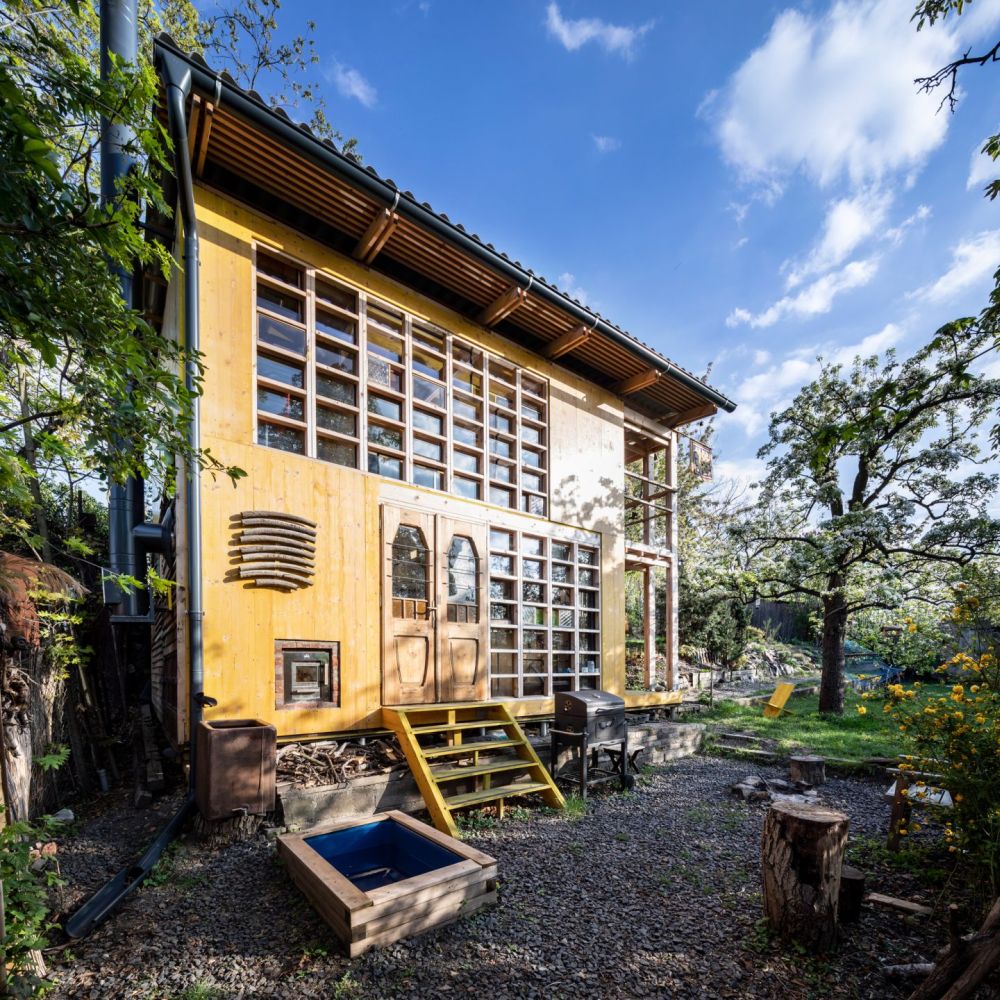 O to víc těší výsledek. Prověřili jsme řadu variant uspořádání požadovaného programu a hledali nejúspornější řešení. V přízemí chaty je pobytová místnost, sauna a drobné zázemí. Nahoře je ochoz s výhledem do zahrady a dětské kajuty podél severní stěny. Prostor je otevřený na celou výšku chaty, v průhledech krásně vyzní prosklené stěny z patchworku recyklovaných oken. Z vyhlídkové galerie vede výstup na jižní verandu nad krytým zápražím. Výsledná podoba chaty vznikla spoluprací architektů a výtvarníků-klientů. My jsme přispěli umístěním, tvarem, dispozicí, konstrukčním a technickým řešením. Připravili jsme základní „bedničku“ jako racionální stavební matrici provedenou v konstrukčním systému 2 by 4.