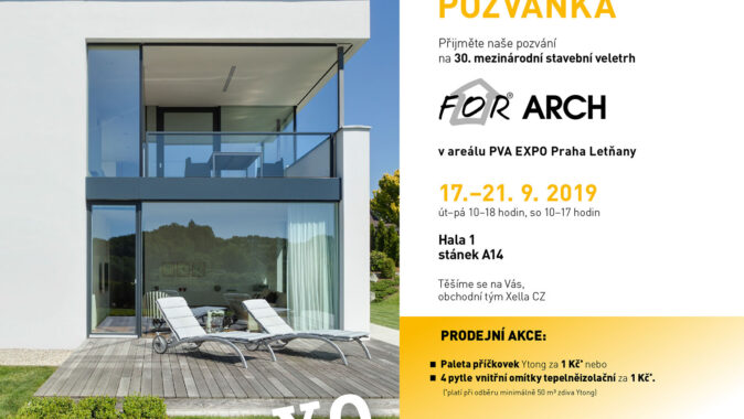 Na výstavišti v Letňanech se od 17. do 21. září představí systém Ytong spolu s dalšími značkami výrobce Xella na jubilejním 30. For Archu a nabídne materiál za speciální veletržní cenu. Značka se bude prezentovat formou fragmentu kompletního stavebního systému Ytong a příbuzných značek vápenopískové tvárnice Silka a minerální tepelněizolační desky Multipor. Návštěvníci si tak mohou v praxi prohlédnout prvky, jako jsou masivní střecha či systémové vnější i vnitřní omítky. Součástí prezentace budou ukázky skladeb zdiva pro dosažení nízkoenergetického až pasivního standardu.