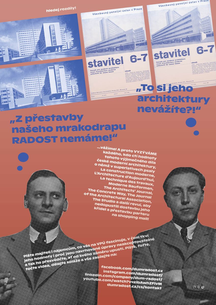 Osud naší moderní architektury, především českého funkcionalismu, který nás ve světě nejlépe reprezentuje, mi obzvlášť leží na srdci. Už proto jsem se jako člen poradního orgánu generální ředitelky Národního památkového ústavu (Komise pro ochranu památkového fondu vzniklého ve 2. polovině 20. století) k navrhovanému řešení vyjádřil jednoznačně negativně. Také mě těší, že kromě kolegů z komise, která se už dávno věnuje veškeré architektuře 20. století, aniž by se stačila přejmenovat, spatřuje celou věc stejně problematicky i Komise pro urbanismus, veřejný prostor a regeneraci městské památkové zóny Městské části Praha 3. A protože mám o budoucí podobu VPÚ oprávněně vážné obavy, nezbývá mi jiná cesta, než tato výzva. Mrakodrap VPÚ nesmíme, tak jako obchodní domy Ještěd a Máj anebo Transgas, už ztratit.