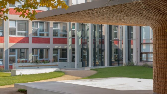 přiznaným železobetonovým skeletem a jednotným formátem oken. Budovy fakult