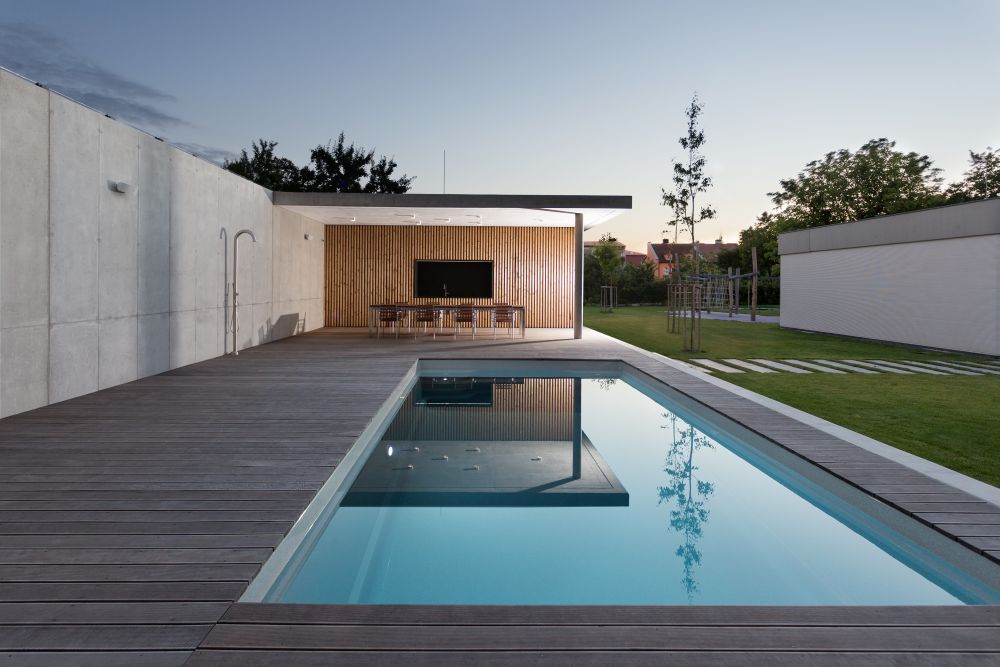uzavírá atrium, které dále zvětšuje o prostor bazénu a terasy. Její hmoty navazují