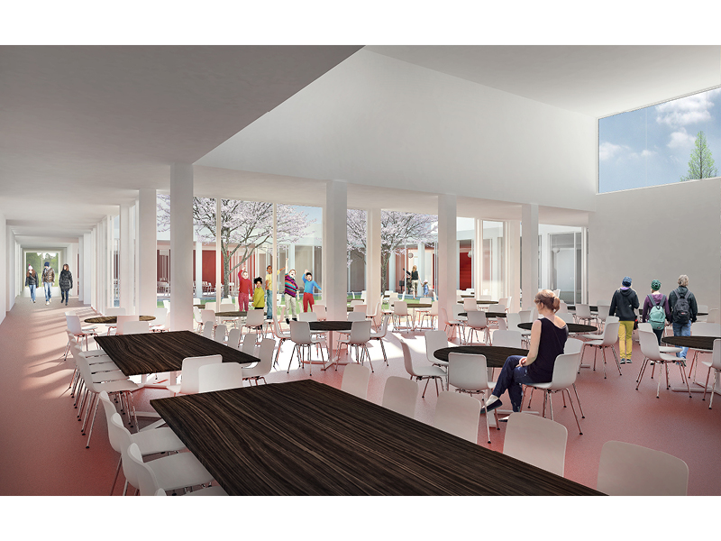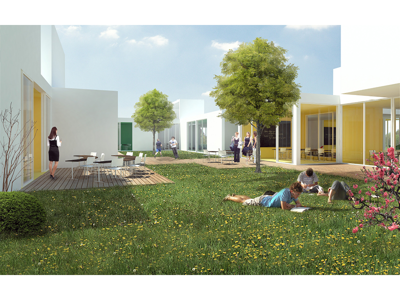 Vznikají čtyři dvory pro jednotlivé skupiny dětí s učiteli. Tři z těchto dvorů jsou poloveřejné, centrální dvůr je veřejný a určený všem uživatelům školy včetně návštěvníků. Každá třída má možnost se rozšířit do interiérového tak do exteriérového prostoru. Společné interiérové komunikační prostory nejsou pouhými chodbami, ale přístupnými pobytovými prostory. Zvolené horizontální řešení areálu zajišťuje dětem možnost neustálého kontaktu s exteriérem.