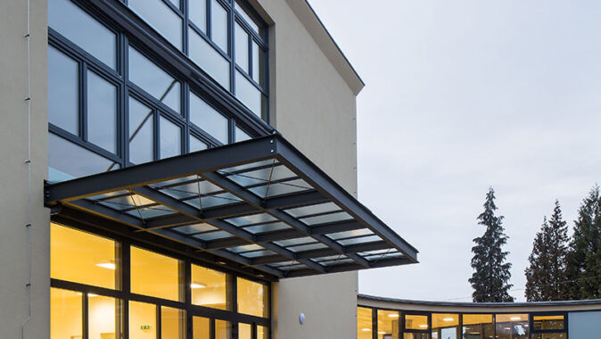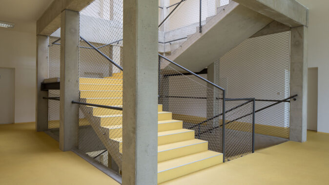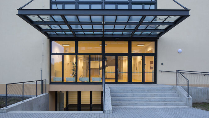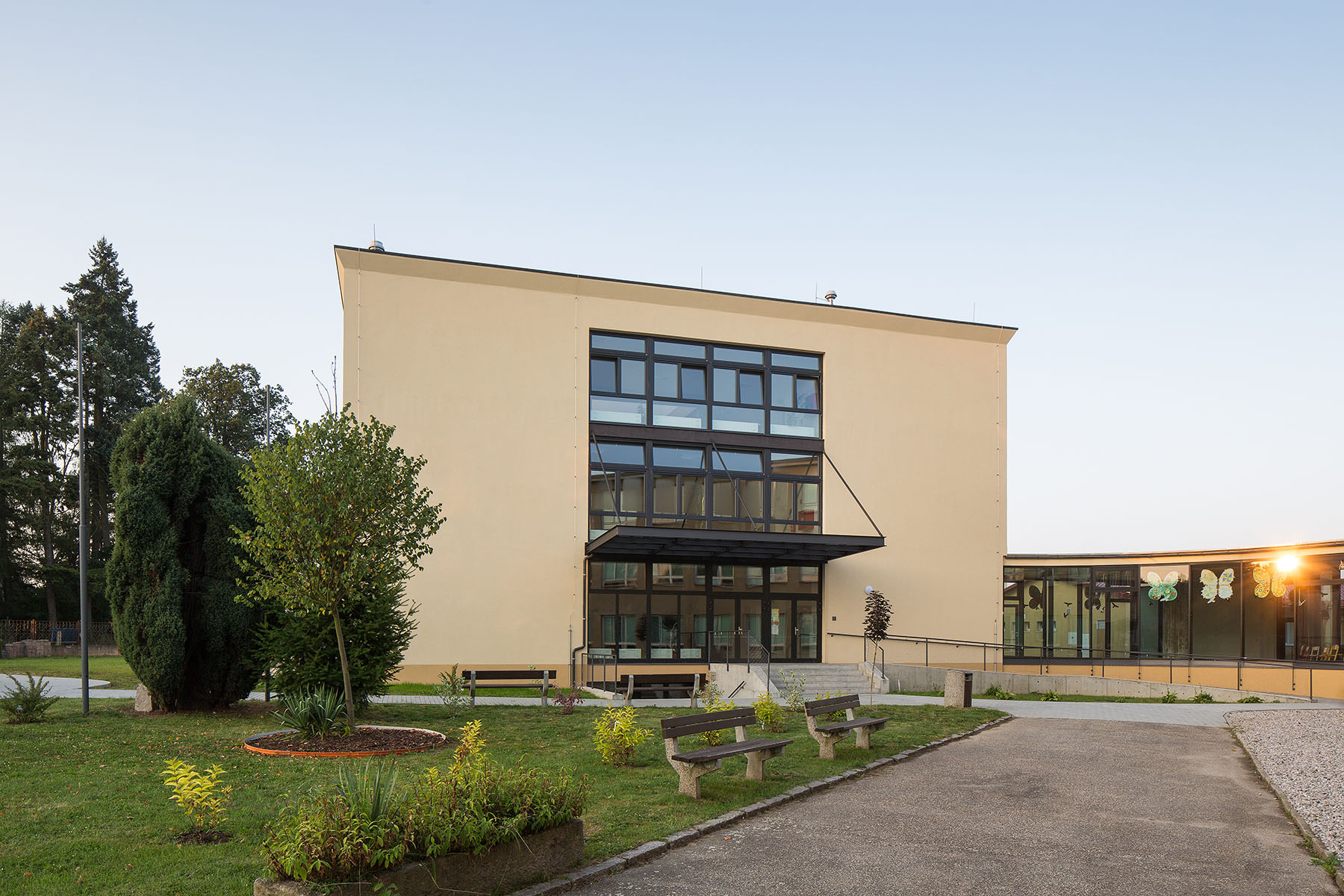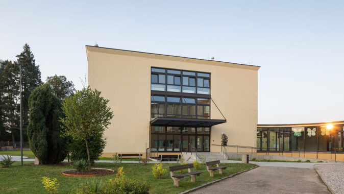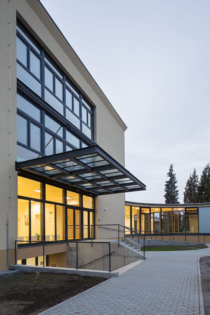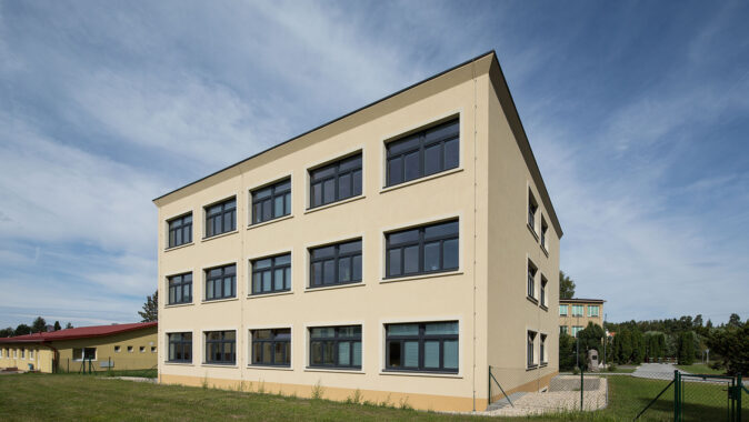Dům jsme navrhli jednoduše, s ohledem na investiční náklady. Fasáda je omítnuta béžovou kletovanou omítkou, bílé šambrány zvýrazňují okna, podlahy jsou pokryté linoleem v sytě žlutém odstínu v hale a vínovém ve třídách. Kompaktní tvar stavby snižuje náklady na její provoz.