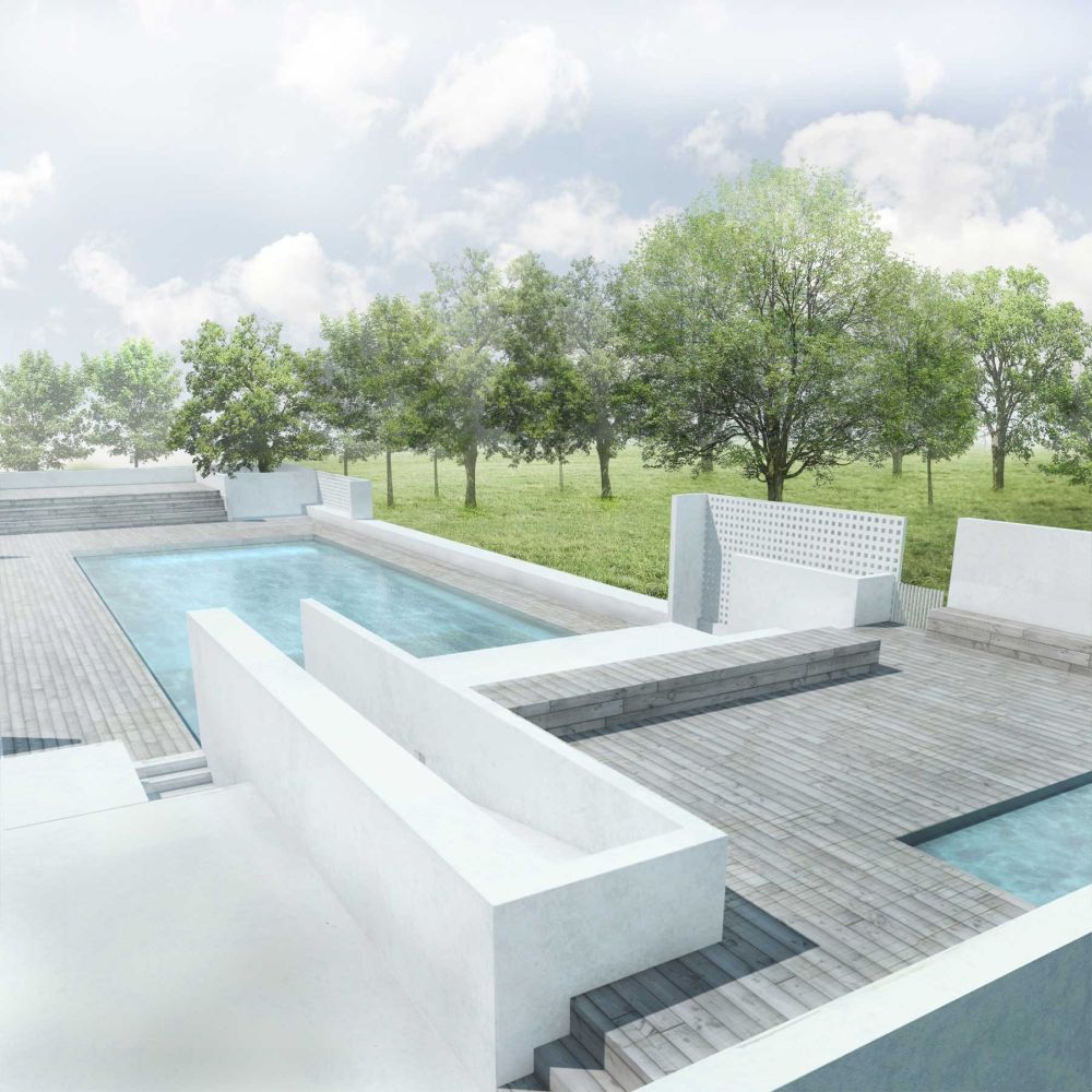 Bazénová plocha díky svému vyvýšení vytváří z lidí napůl herce, kteří se