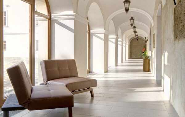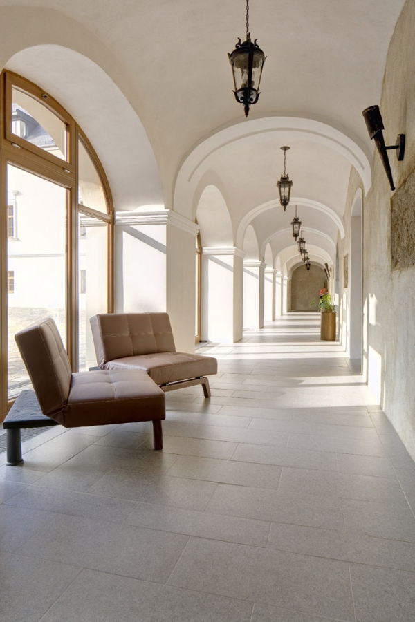 „Nejsem zastáncem historizujících stylů, nejpoctivější je podle mě přiznat, že se jedná o nové věci. Do historických prostor jsme tedy vraceli přírodní kámen nebo dřevo, prostory, které dříve neexistovaly, jako jsou třeba hotelové pokoje nebo nové schodiště, tam jsme materiálovým provedením dávali najevo, že se jedná o nové prvky. Samozřejmě jsme vybírali materiály, které svou nadčasovostí a neutrálností s původními souzněly, v gastro místnostech, mokrých provozech, jako je bazén, či v technickém zázemí jsme zase dbali na hygienické a bezpečnostní předpisy,“ vysvětluje architekt Ing. Zsolt Papp, proč volba padla na české keramické obklady RAKO od společnosti Lasselsberger.