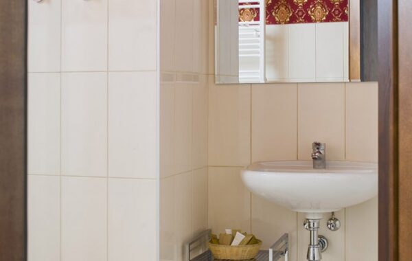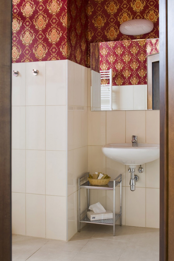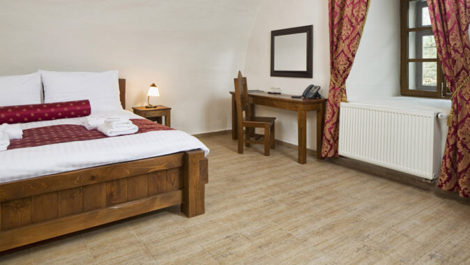Podobné zadání ladit s původními materiály splnila i dlažba série Travertin (RAKO) s jemně reliéfním lapovaným povrchem, která byla položena na podlahách několika apartmánů a která má rovněž blízko k přírodnímu kameni. V přilehlých koupelnách všech hotelových pokojů pak na ni navázala dlažba a obklady série Concept. „Desingově nenápadné a neutrální barvy této série umějí ladit v podstatě s čímkoli, ať už to byly červeně vymalované stěny koupelny, výrazné rustikální dekory či původní kamenný kus zdi,“ dodává Ing. Ľudovít Bulla.