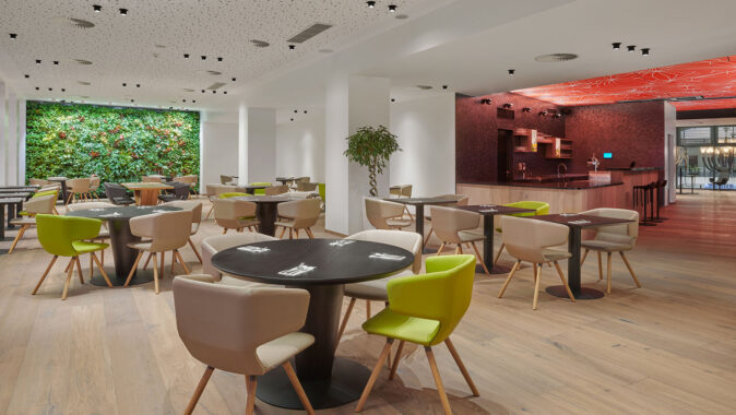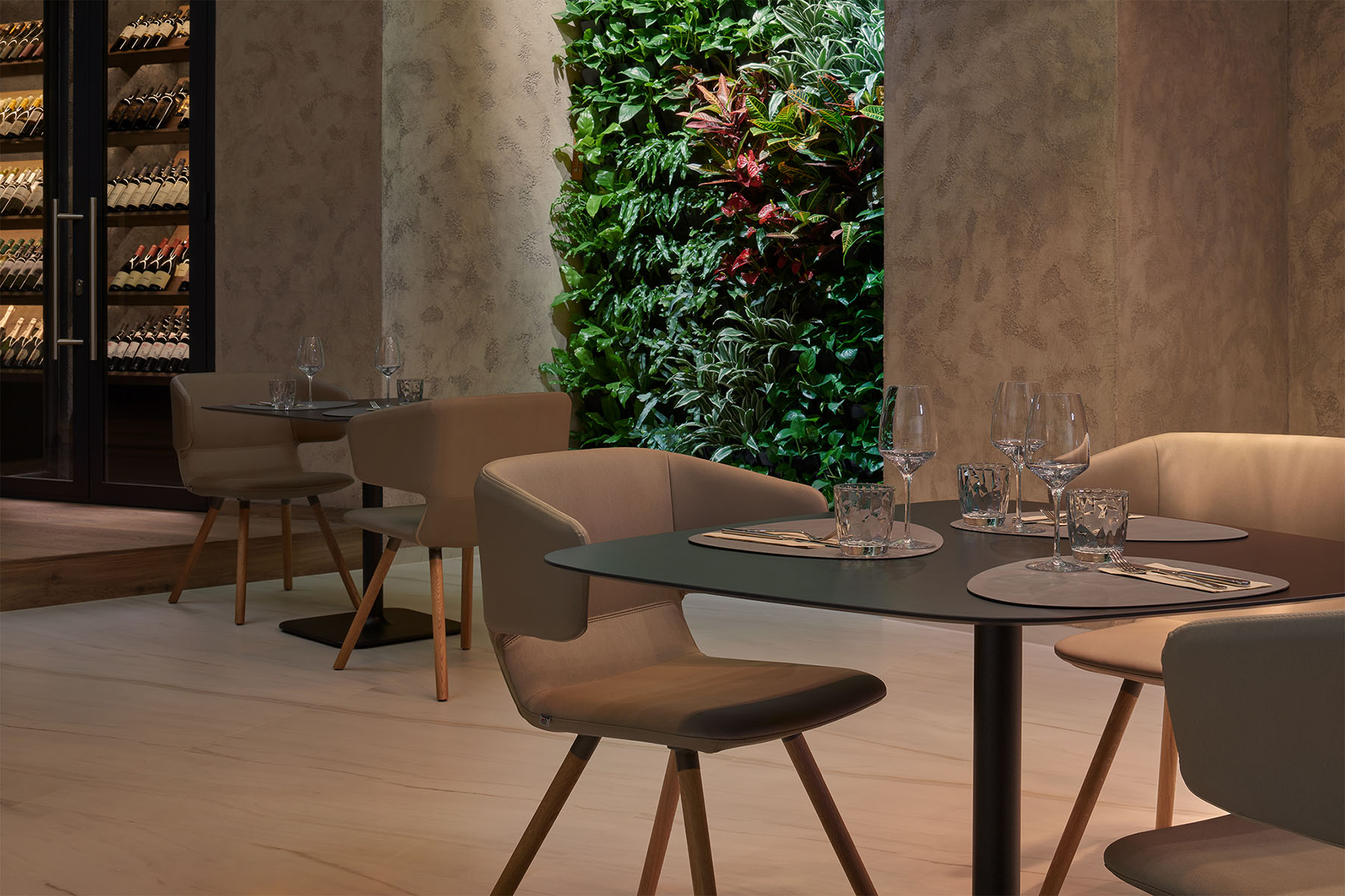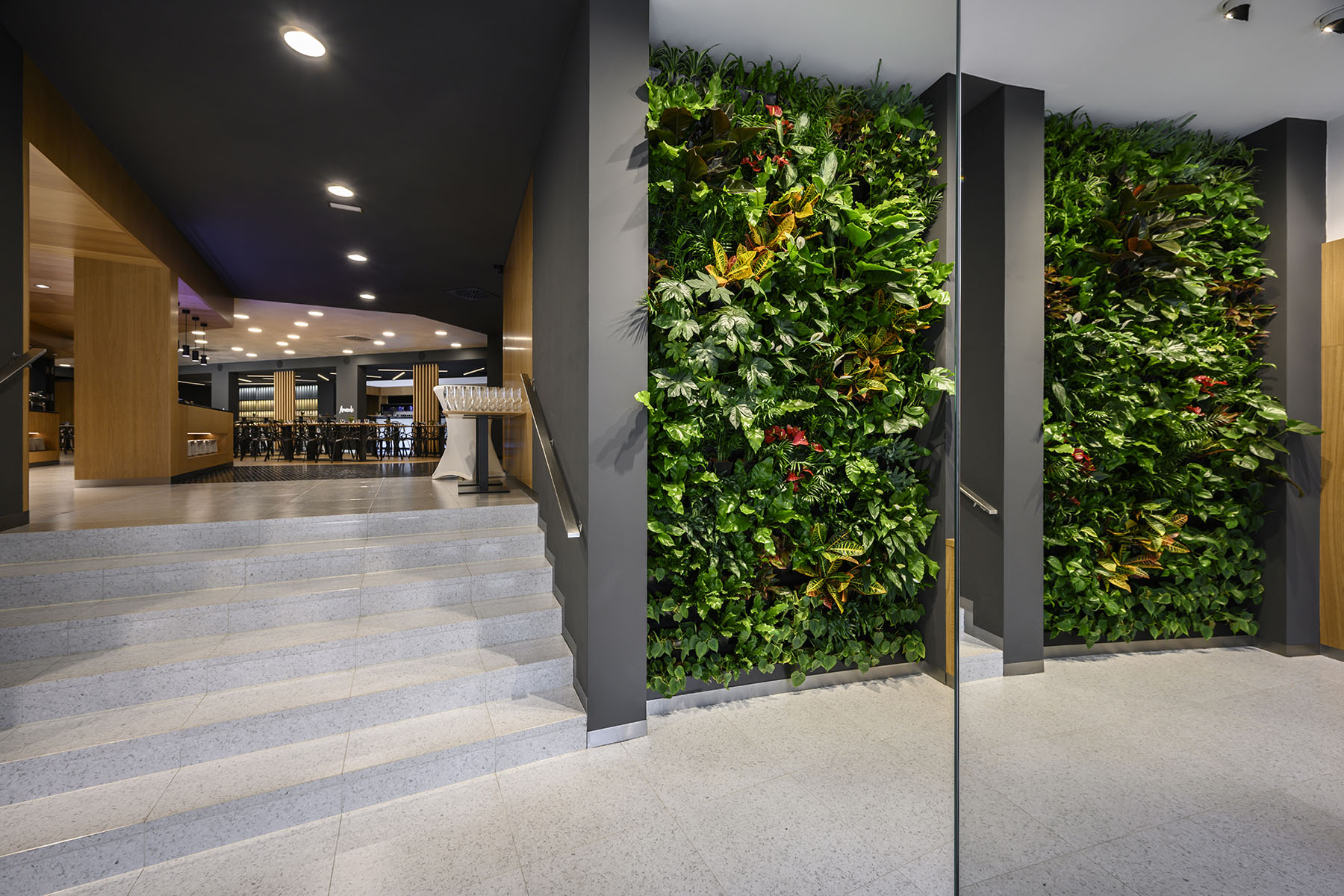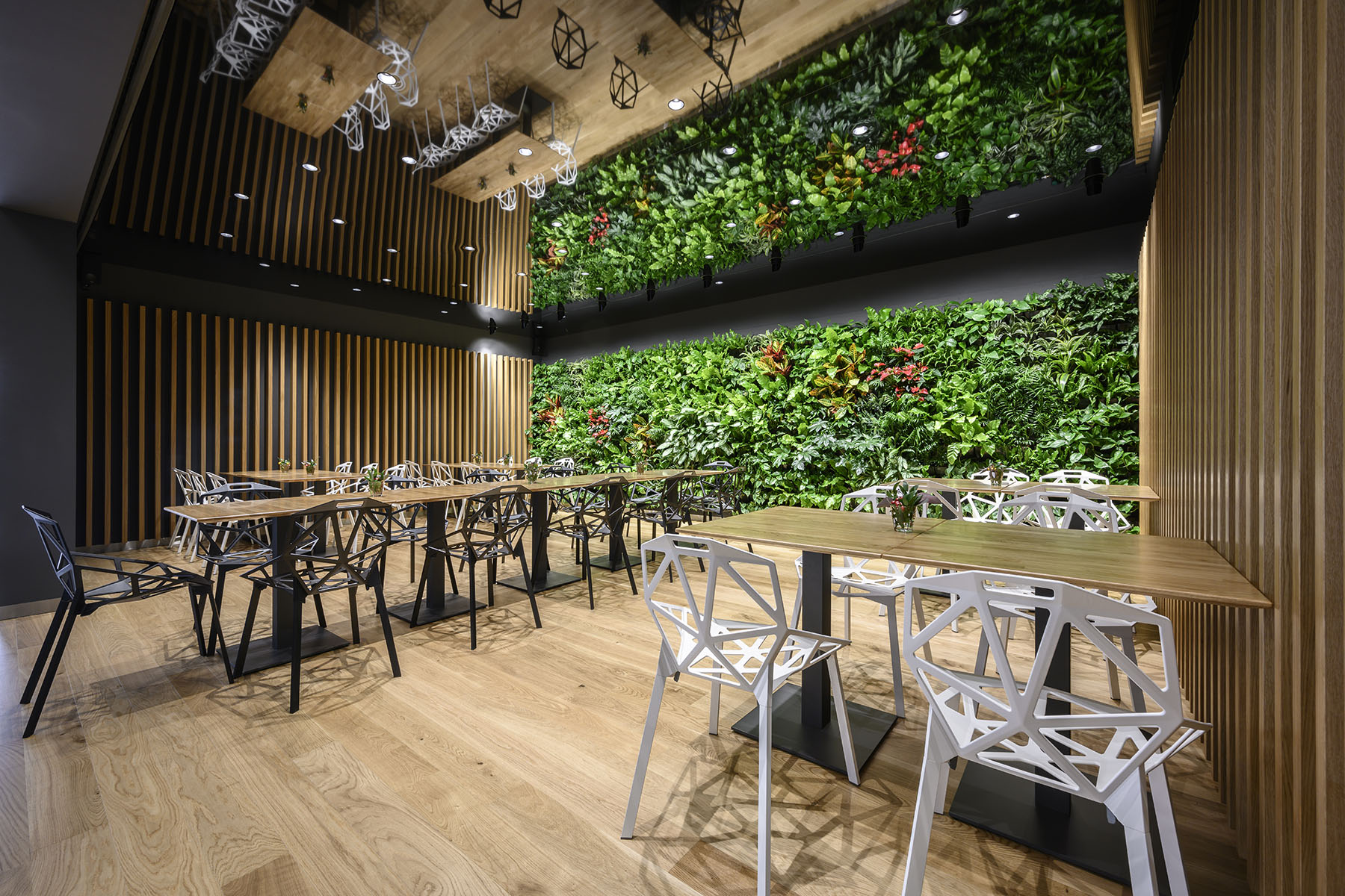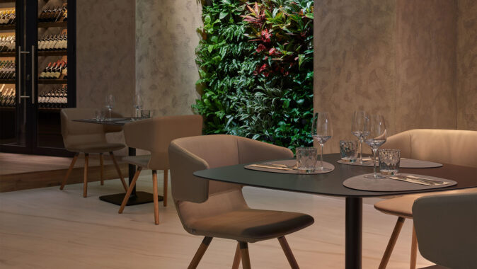 kaskádová zahrada v restauraci dodává silný kontrapunkt minimalismu