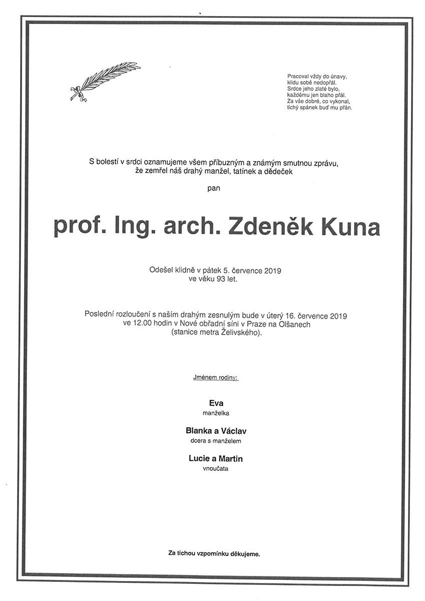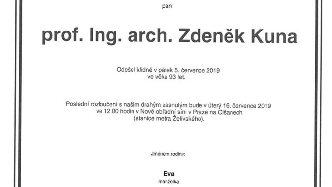 rozloučení se Zdeňkem Kunou se uskuteční v úterý 16. července 2019 ve