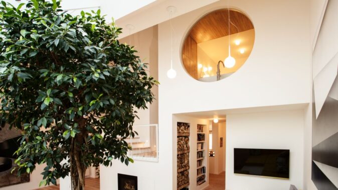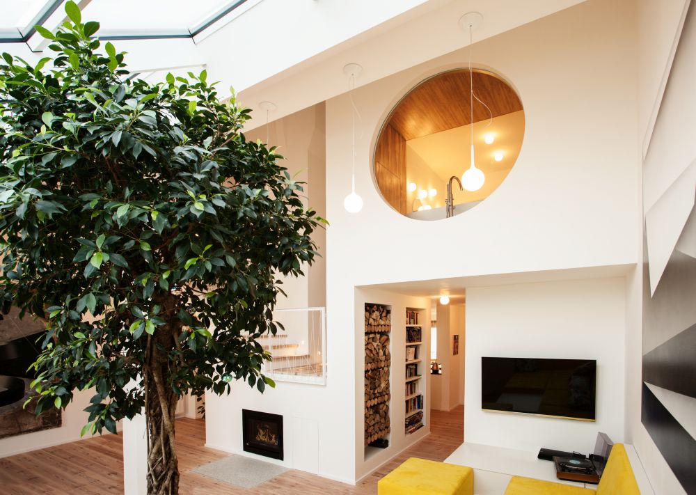 Jedním ze základních východisek při koncipování návrhu sehrál fakt, že klienti jsou vášniví sběratelé obrazů. Výsledné řešení tudíž ponechává do značné míry prázdné bílé stěny jako neutrální galerijní pozadí pro rozrůstající se sbírku. Zavěšené obrazy doplňují komponované interiérové elementy představující další umělecké instalace – světelná mozaika nad manželskou postelí, kruhový výřez ve stěně mezi koupelnou a obývacím pokojem s průhledem na vanu (okno stíní vestavěná roleta na elektrické ovládání) anebo velkoformátový obraz oblíbené autorky klientů, natištěný na skle nad kuchyňskou přípravnou deskou.