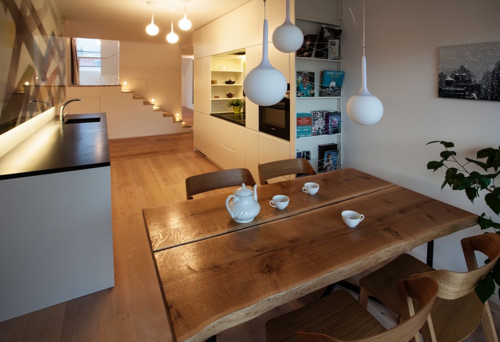 Ten jídelní stůl na mě zapůsobil jako zjevení. Mezi vším tím nábytkem s ostře řezanými hranami se najednou objeví něco, co, neumím přesně popsat proč, ale snad jakousi nedokonalostí (ať už úmyslnou z výroby nebo vzniklou léty užívání), působí přívětivě a lidsky. A v kombinaci s ohýbanými opěrkami židlí a kapkovitými svítidly je to dokonalé.