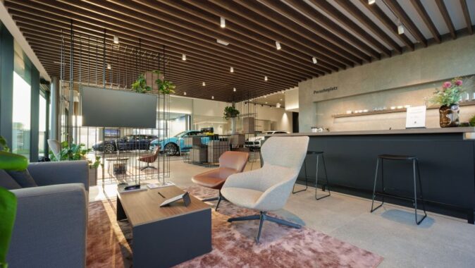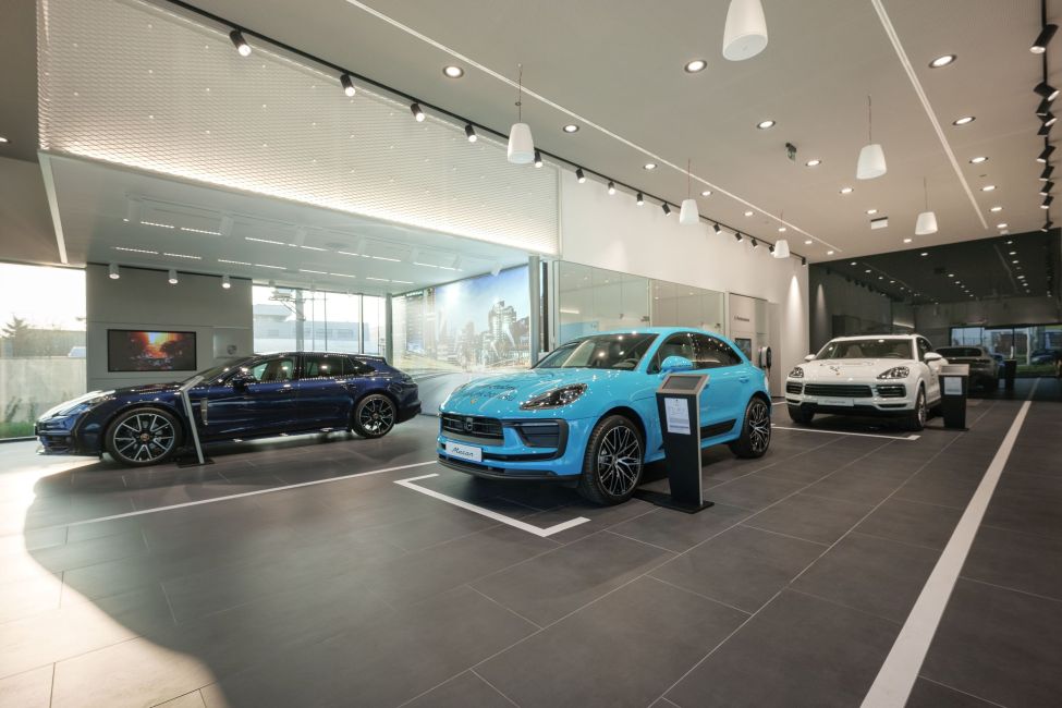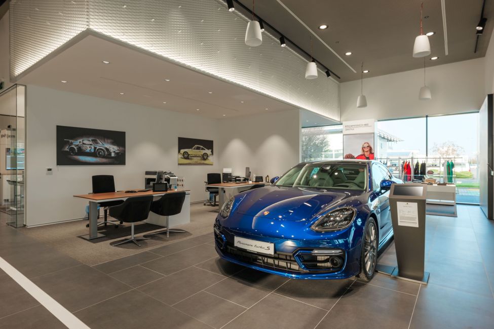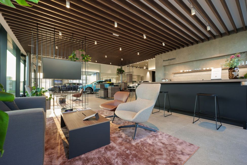 Interiér budovy na ploše 400 m2 je rozdělen do čtyř modulů: Highlight (exkluzivní modely), E-Performance (elektrické vozy a PHEV), Porsche Approved (ojeté vozy, příslušenství Tequipment a Lifestyle) a Porsche Platz (kavárna).